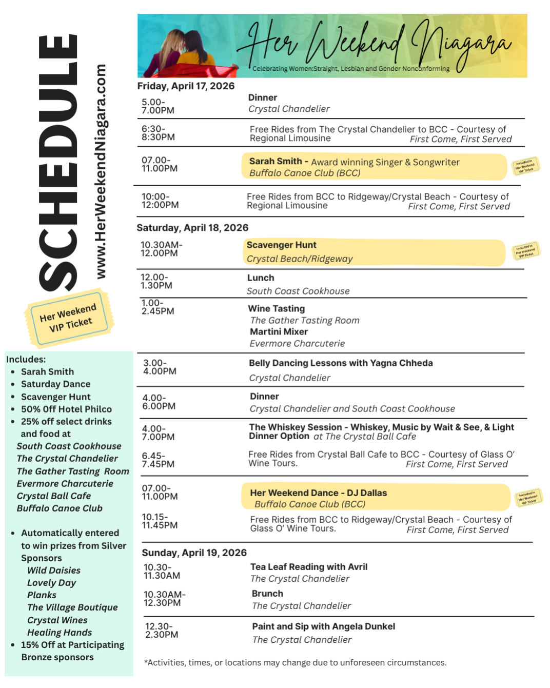 Her Weekend is a three-day lesbian and women’s celebration happening April 17–19 in Crystal Beach, Ontario, in the heart of the Niagara Region.